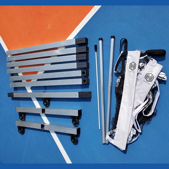 DURABLE AND LIGHTWEIGHT Designed to last for indoor and outdoor play Frame is made of high-quality 6061 T6 aluminum (same material that is used in aircraft, automotive, and watercraft manufacturing) Aluminum is sturdy, lightweight, & completely weather resistant 2″ Thick Heavy Duty Aluminum Frame- Rust Proof Frame and Hardware Includes Limited Lifetime Warranty RUST PROOF Pickleball frame is entirely rust-proof Aluminum frame and stainless steel hardware Perfect portable pickleball net for outdoor play because it’s completely waterproof EASY STORE OR ROLL-AWAY Frame breaks down into sections that fit into a carryable bag Net and frame are easy to assemble and put away Pickleball frame has wheels on the bottom for better mobility Wheels lock in place which prevents movement of the net during play. PERFECT FOR FAMILY FUN OR A COMPETITIVE MATCH Uniquely designed to create the best pickleball experience Perfect portable pickleball net for families, competitors, or both! Regulation size net and dimensions Includes Rolling Carry Bag QUICK AND EASY ASSEMBLY Assembly takes less than two minutes Each aluminum rust proof section breaks down to fit in a carriable bag Bag can be carried or rolled away like a suitcase. * Pickleball paddles not included