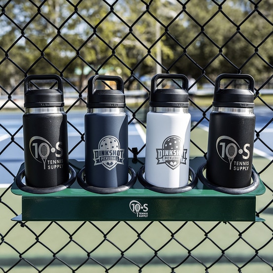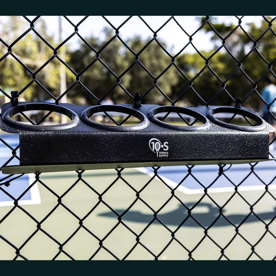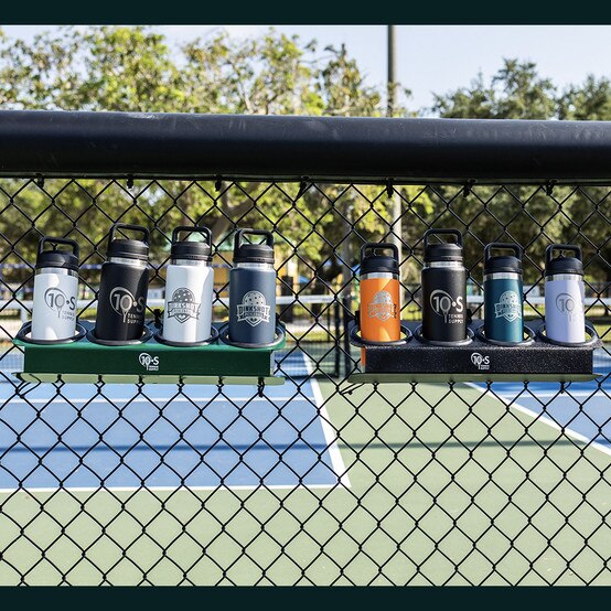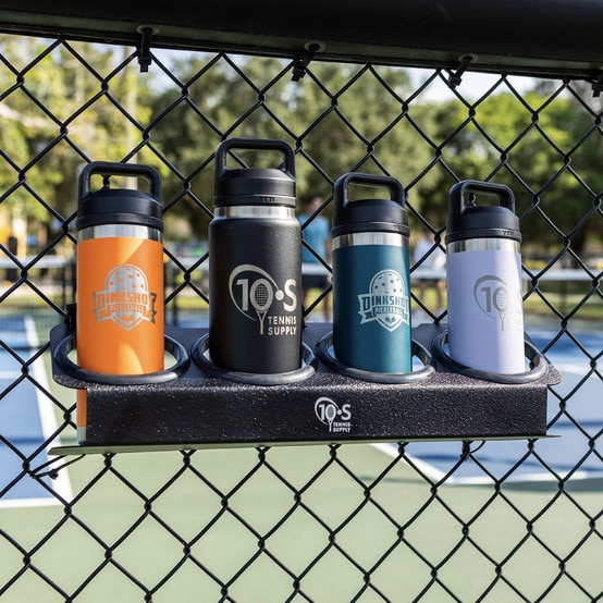 The Dinkshot Titan Water Bottle holder is the perfect accessory for any pickleball court. The Titan easily attaches to any fence allowing players to keep their standard size water bottles and cups off the ground. Made out of rust inhibiting aluminum and powder coated. Place one on each court or multiple for busier facilities. Holds up to 4 standard size water bottles per rack. Incredibly durable and easy to install the Dinkshot Titan is the perfect holder for any facility. Large holes for accommodating many bottle sizes. Maximum base size of water bottle 3 ¼".